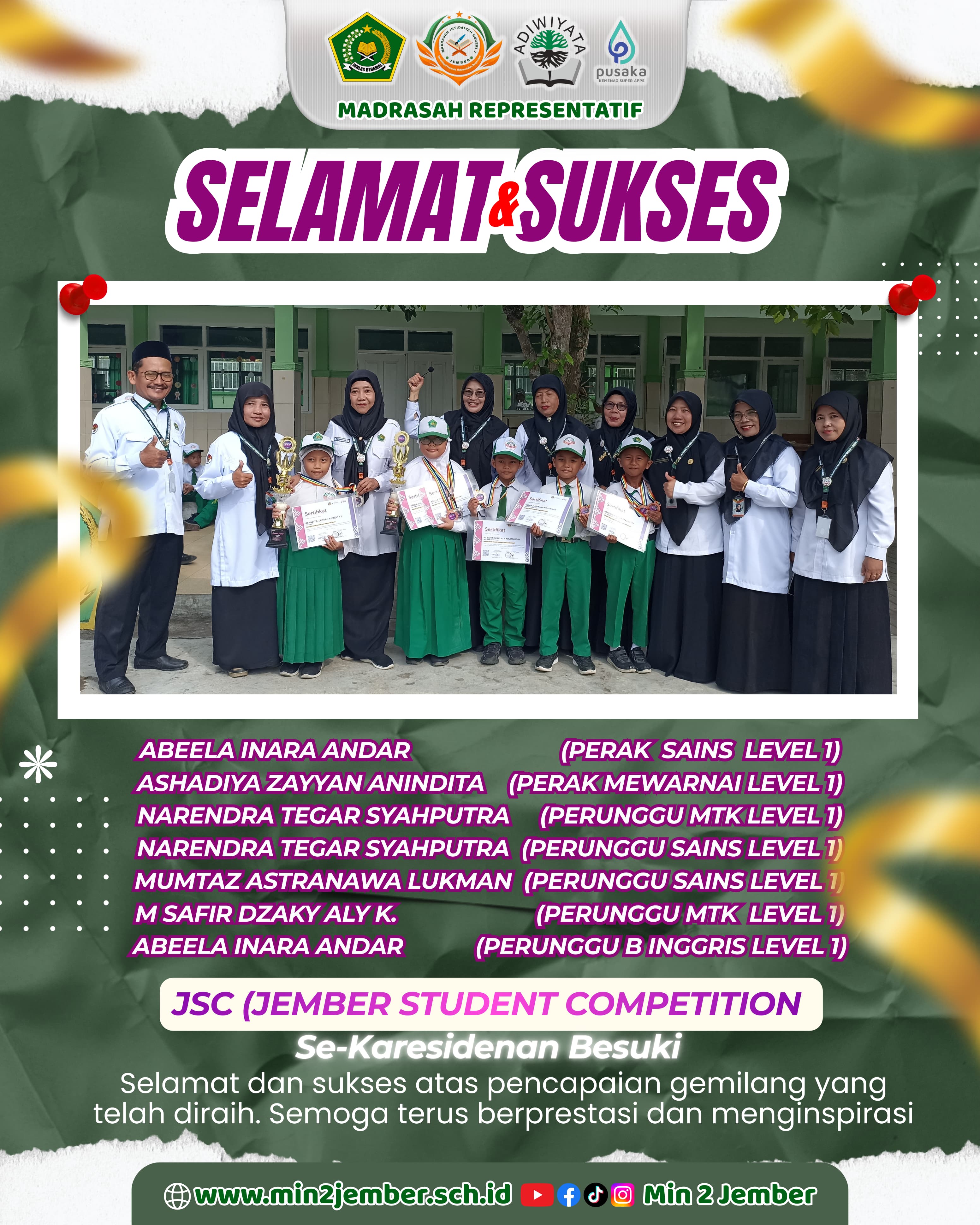 MIN 2 berinovasi dalam menghadirkan generasi berprestasi yang mampu bersaing, berani tampil, dan terus berkembang. Prestasi gemilang yang diraih para siswa dalam ajang JSC (Jember Student Competition) Se-Karesidenan Besuki menjadi bukti nyata dari kerja keras, ketekunan, serta semangat belajar yang luar biasa.
